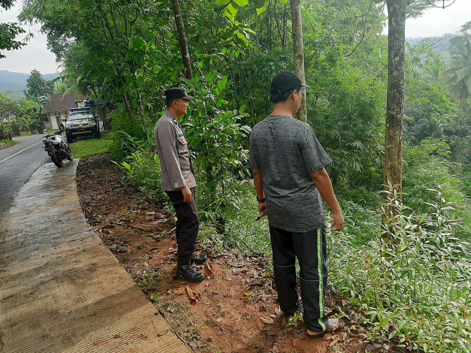 Mereka bersama warga sekitar memeriksa kondisi tebing yang tergerus akibat curah hujan yang tinggi dalam beberapa hari terakhir.