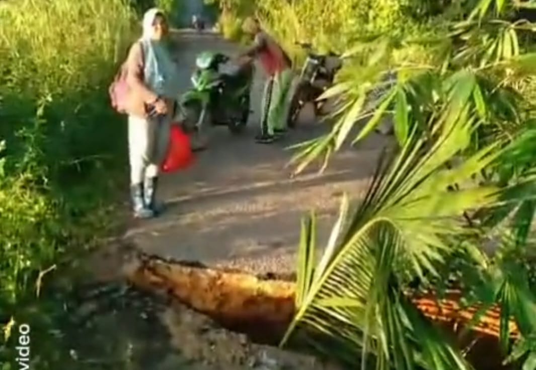 Hujan yang mengguyur secara intensif menyebabkan peningkatan debit air, sehingga jalan aspal ambles dan tidak dapat dilalui oleh kendaraan roda empat.