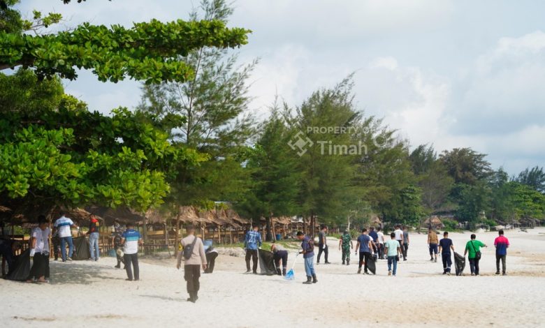 Puluhan karyawan PT Timah bersama masyarakat dan anggota Pokdarwis bergotong royong memungut sampah plastik yang berserakan di sepanjang garis pantai. Tak hanya itu, mereka juga melakukan penanaman pohon Ketapang Kencana dan Kelapa sebagai upaya memperkuat ekosistem pesisir dan memperindah kawasan wisata.