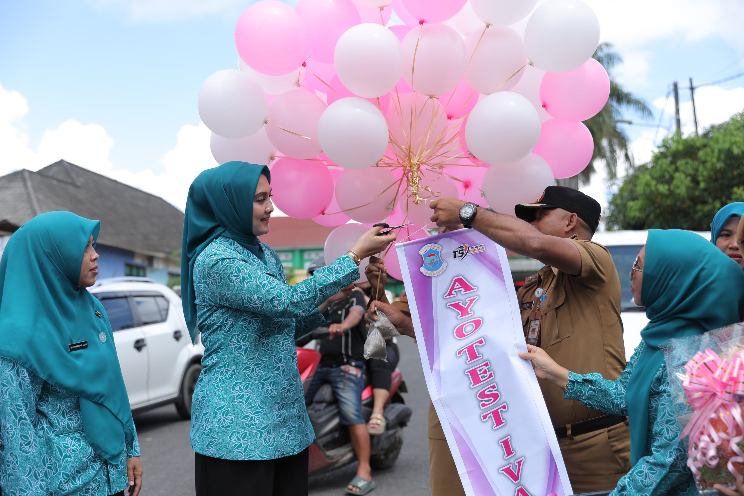 Suasana penyambutan berlangsung meriah. Kader-kader PKK Taman Sari menyambut kedatangan rombongan dengan yel-yel semangat, lalu dilanjutkan dengan pelepasan balon bertuliskan ajakan “Ayo Periksa IVA di Kantor Kecamatan Taman Sari” sebagai simbol kampanye kesehatan perempuan.