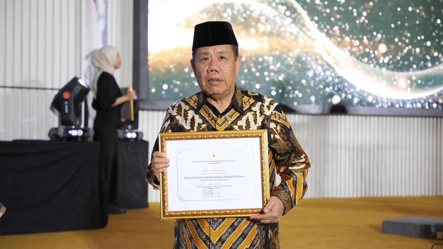 Gubernur Babel, Hidayat Arsani, menerima langsung penghargaan tersebut dari Menteri Koordinator Bidang Pembangunan Manusia dan Kebudayaan, Pratikno.