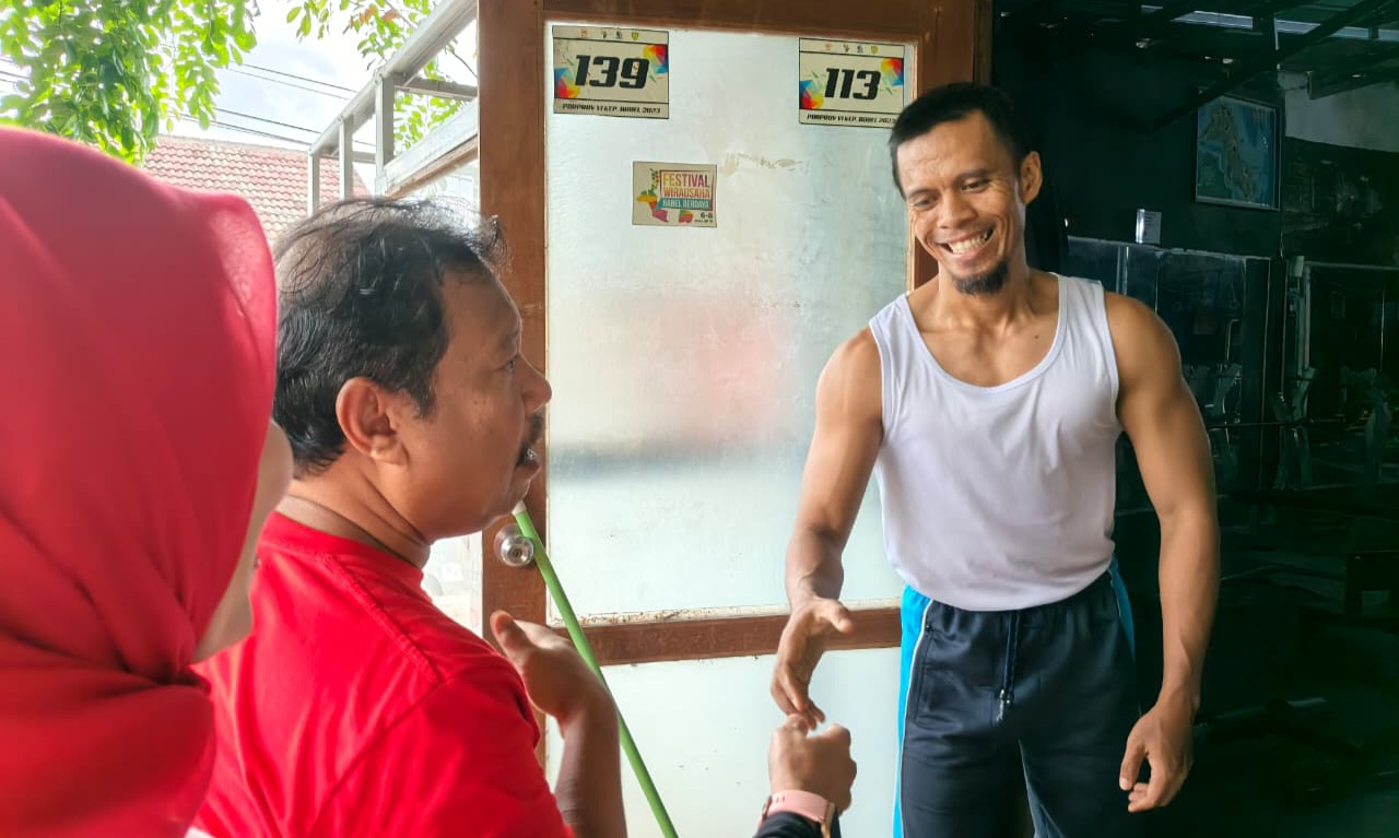 Dari sekian banyak warga yang hadir, ada satu sosok yang cukup menarik perhatian: Candra (37), seorang atlet binaraga sekaligus pemilik Wel GYM Squads.