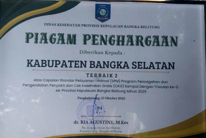 Penghargaan tersebut diberikan oleh Dinas Kesehatan Provinsi Kepulauan Bangka Belitung kepada Kabupaten Bangka Selatan melalui Piagam Penghargaan, yang diserahkan di Pangkalpinang pada Rabu (15/10/2025).